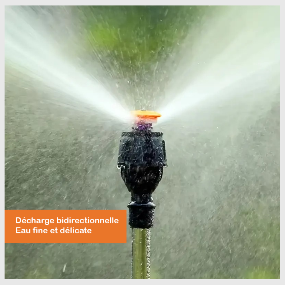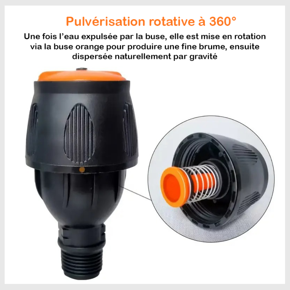 La buse orange diffuse une fine brume en rotation complète, idéale pour un arrosage homogène. L’eau se répartit naturellement par gravité, couvrant efficacement votre jardin sans gaspillage.