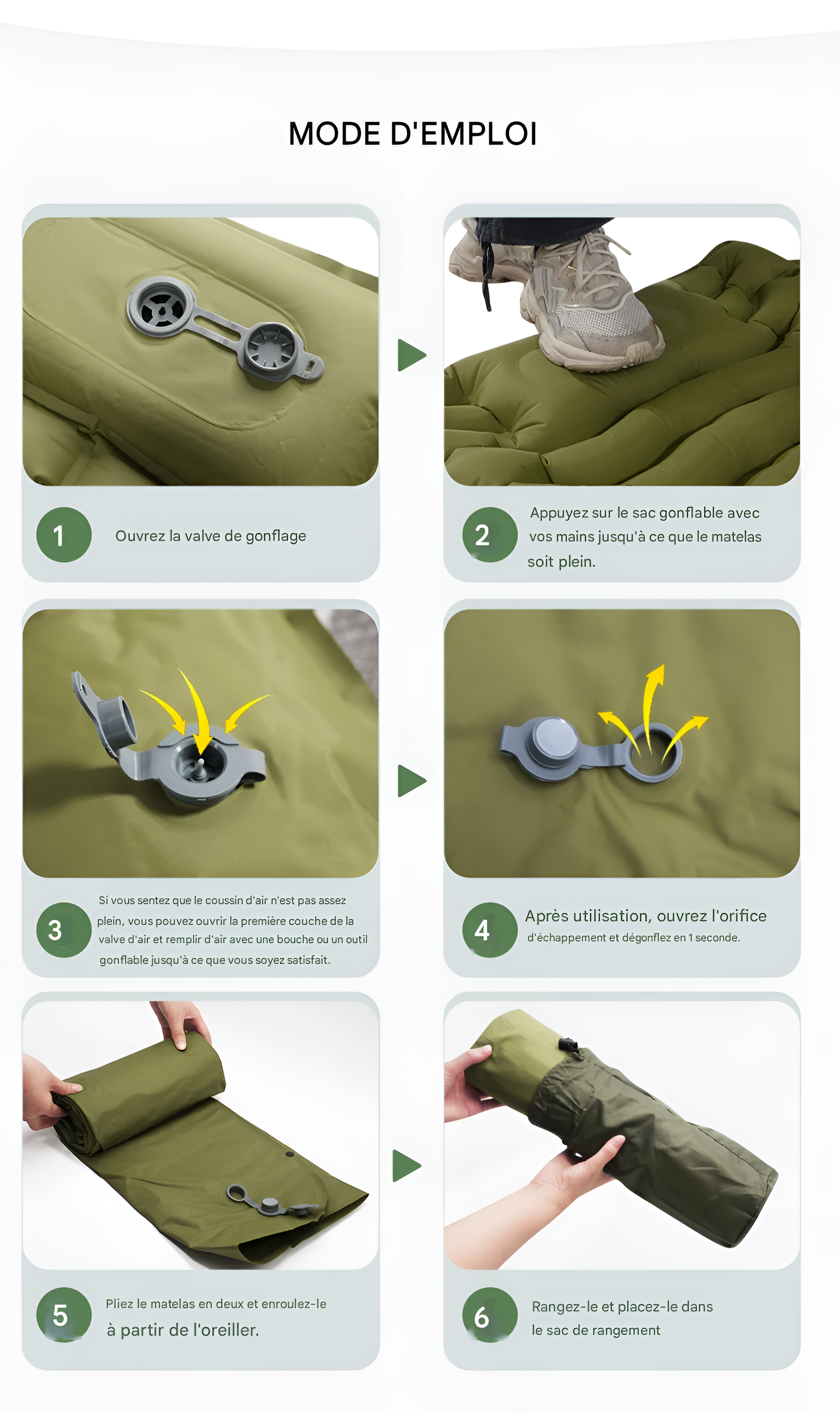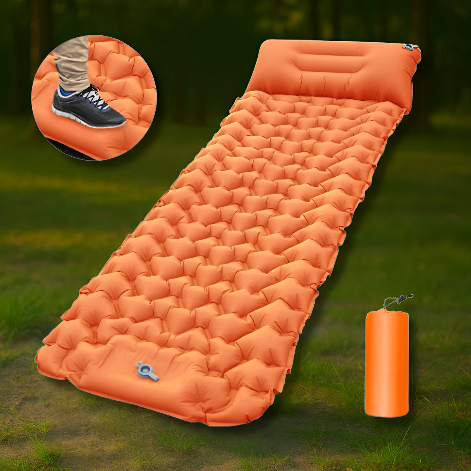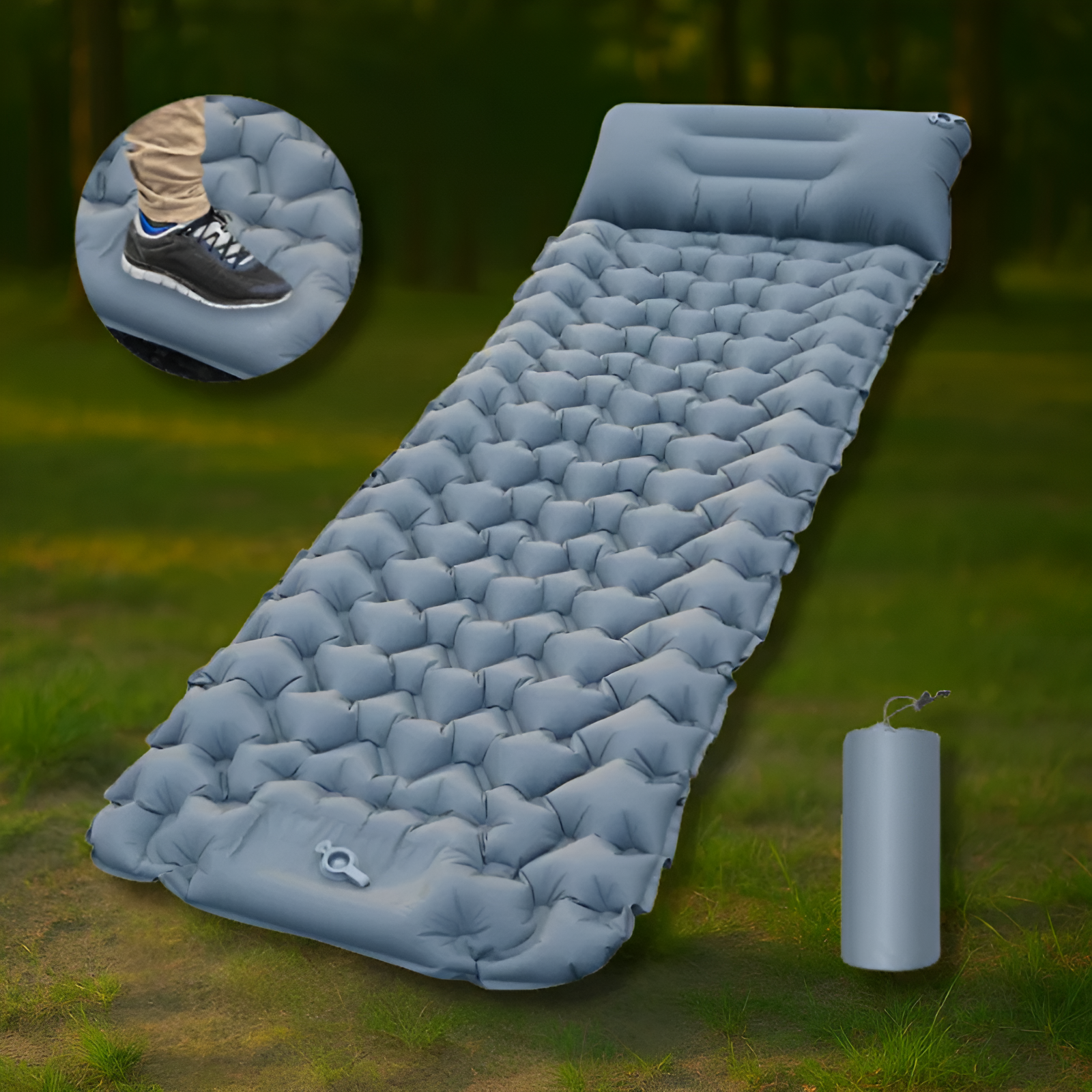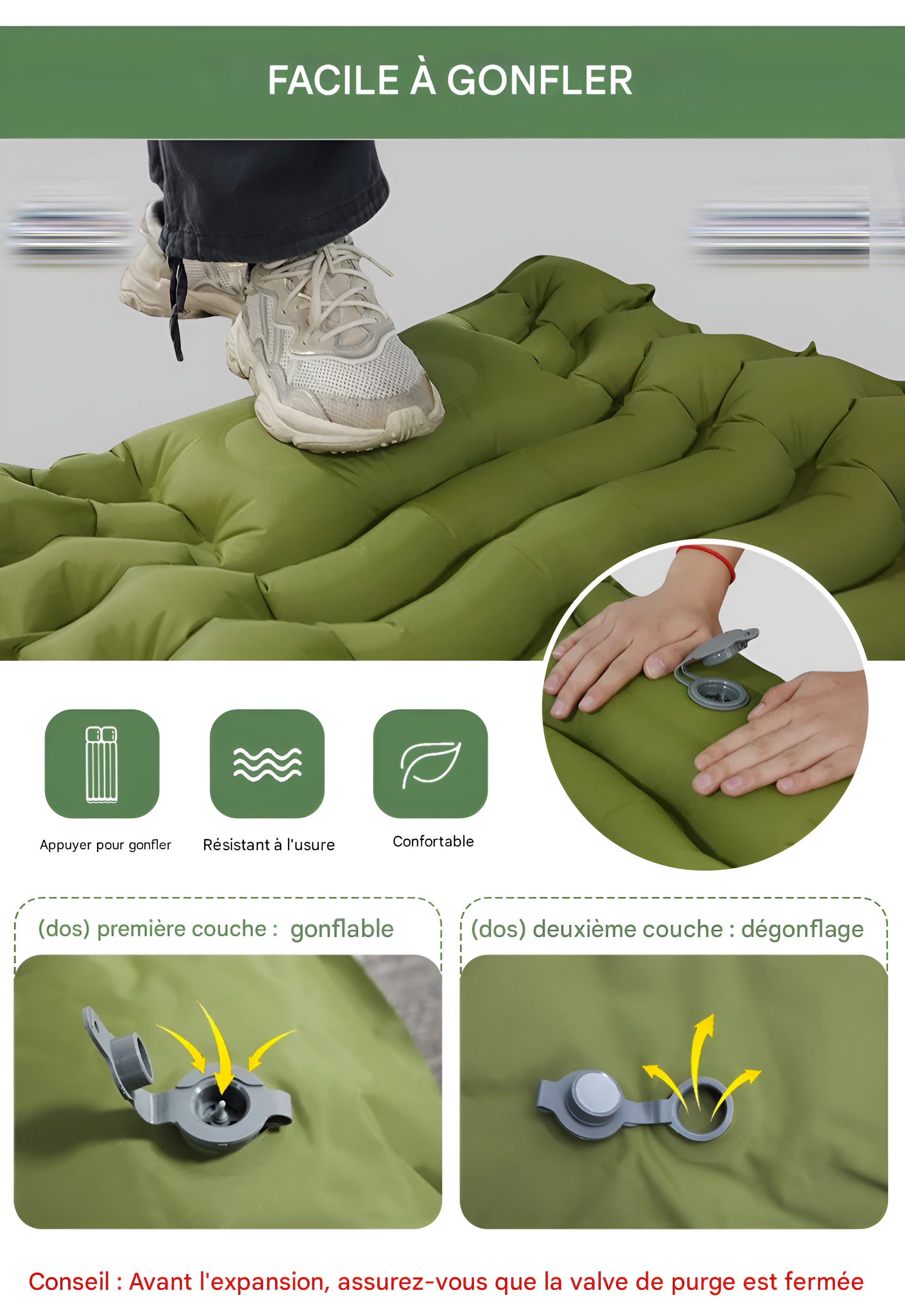 Grâce à la pompe intégrée, ton matelas est prêt en seulement 30/45 secondes. Fini les pompes encombrantes ou les gonflages à la bouche. Il suffit de poser ton pied, appuyer, et voilà — relaxe-toi instantanément.