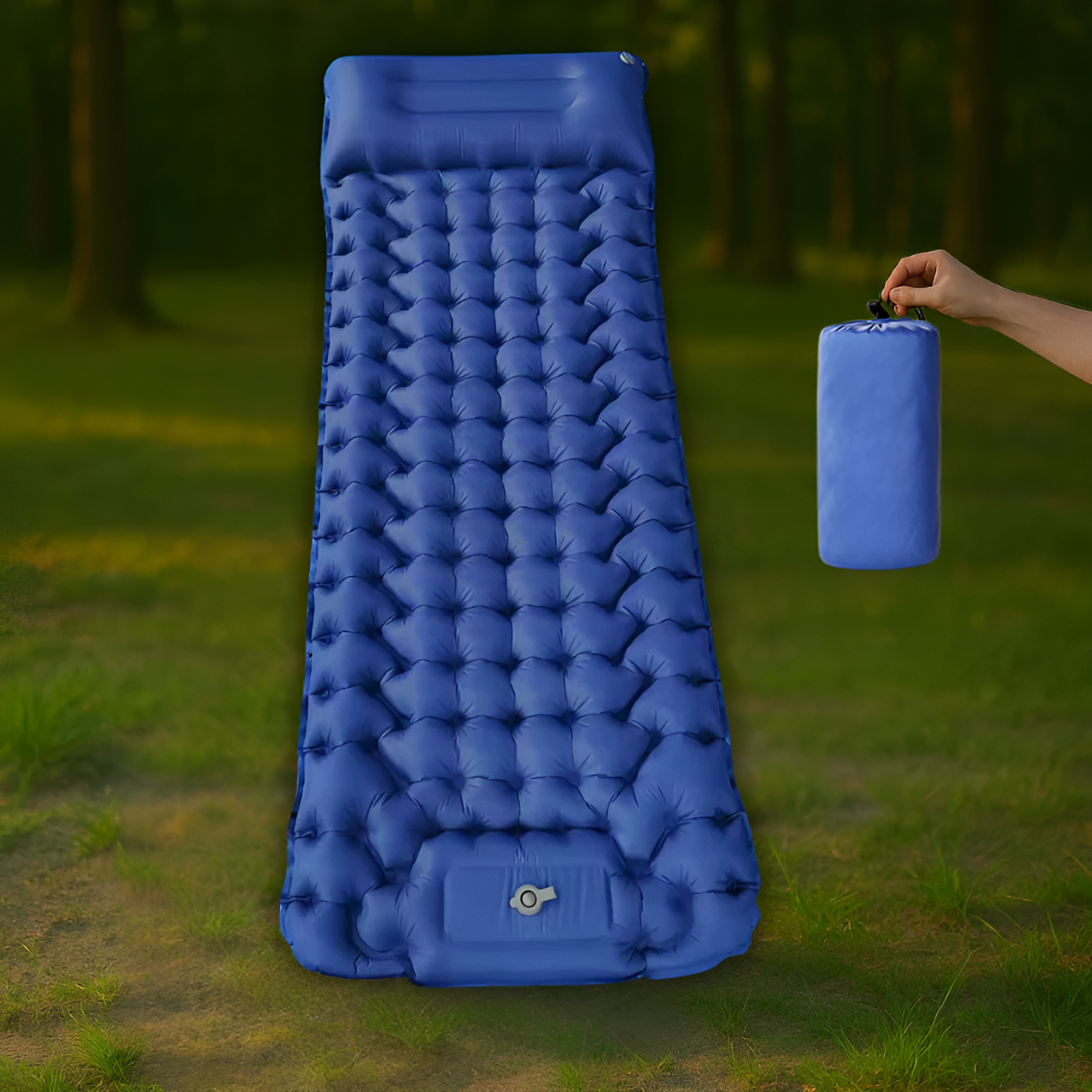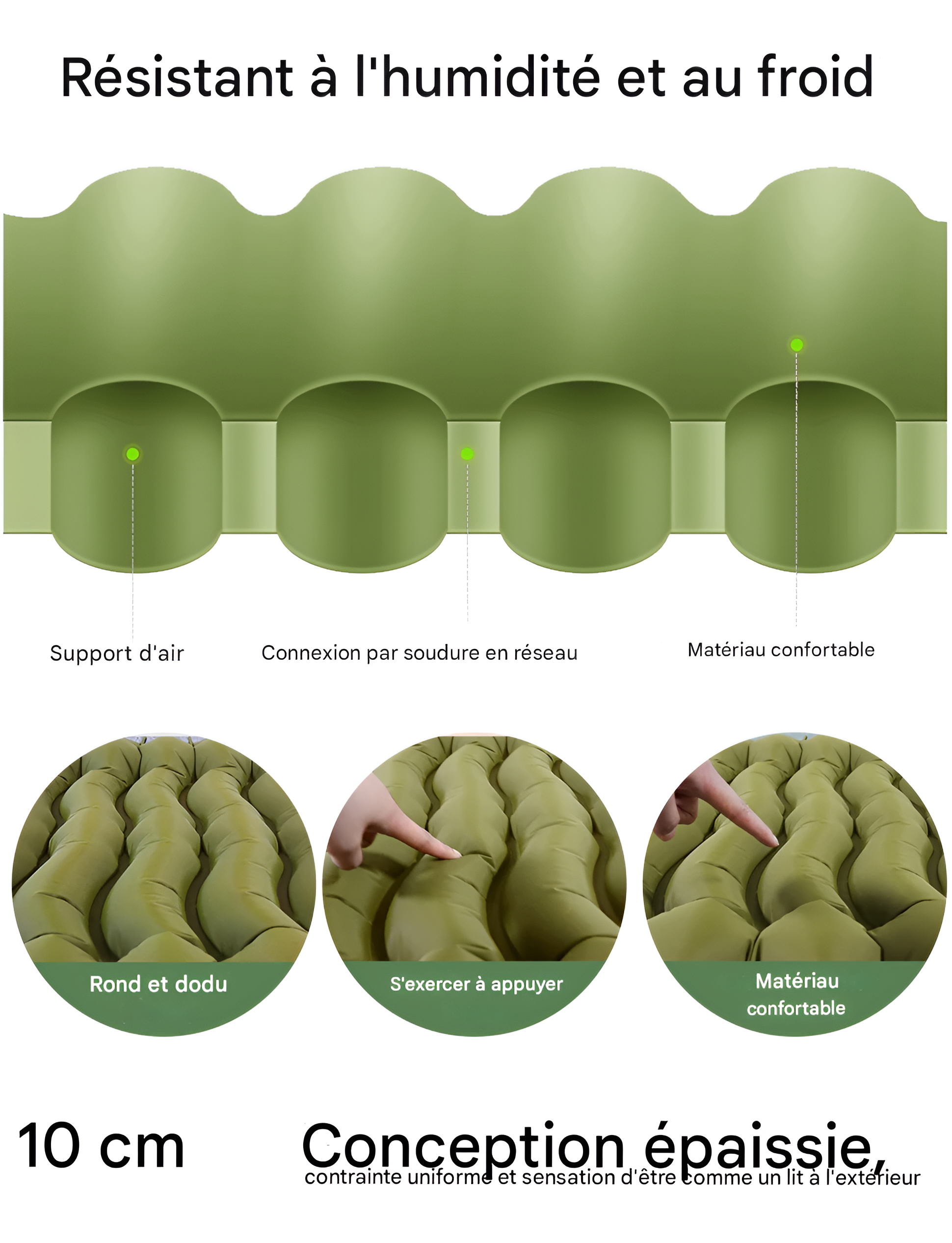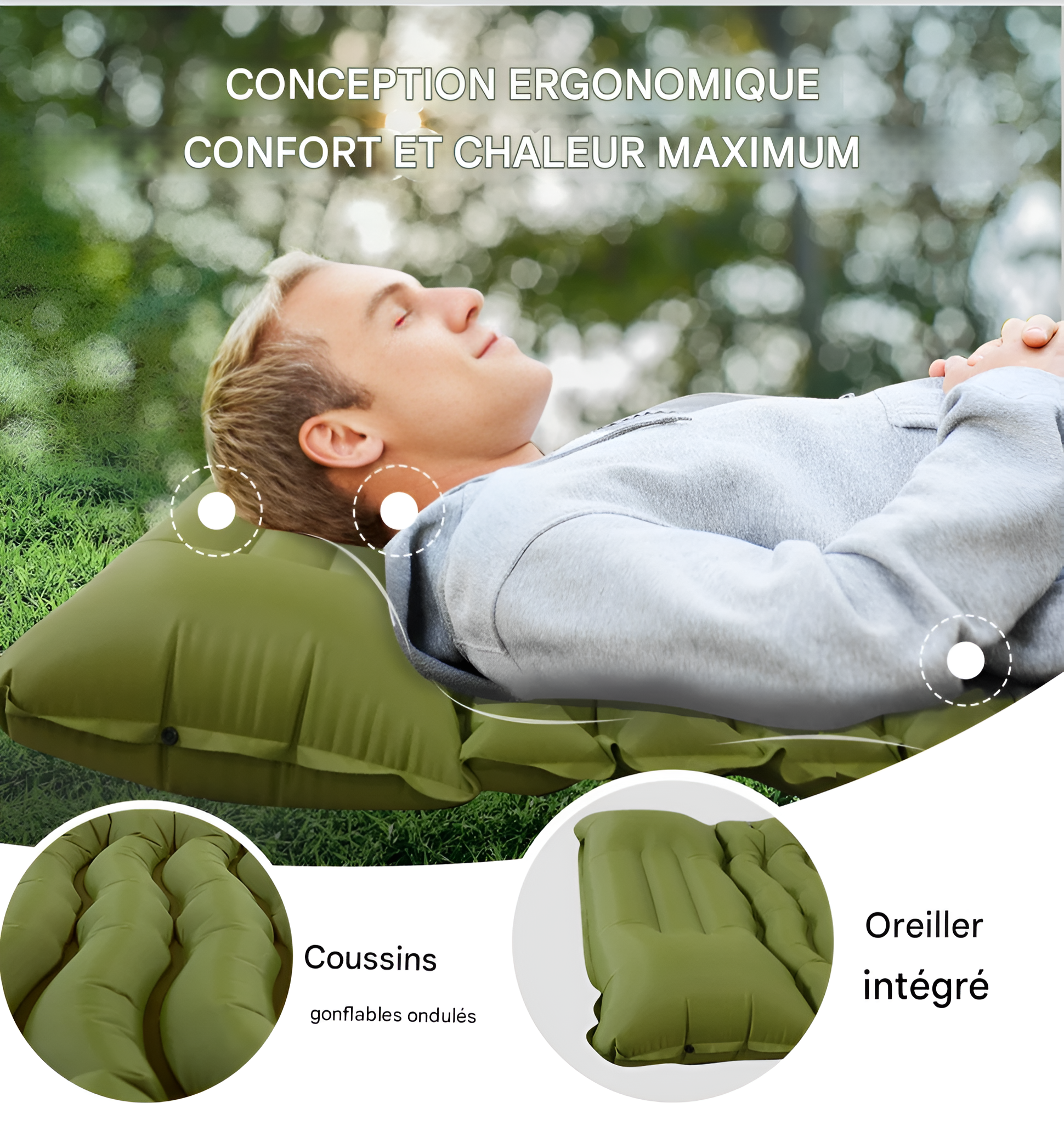 Tu cherches un matelas facile à transporter, rapide à gonfler et super confortable ? Ne cherche plus. Ce matelas gonflable est fait pour toi. Que tu sois camping, randonnée, plage ou simplement détente au lac, il t’offre un confort maximal sans t’alourdir.