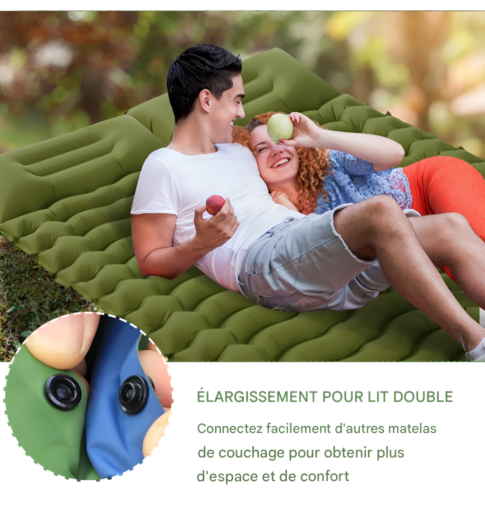 Besoin d’un lit double ou d’un espace plus grand ? Les boutons-pression latéraux te permettent de connecter plusieurs matelas ensemble en un rien de temps. Ajuste ta position, crée ton espace détente, c’est simple et efficace.