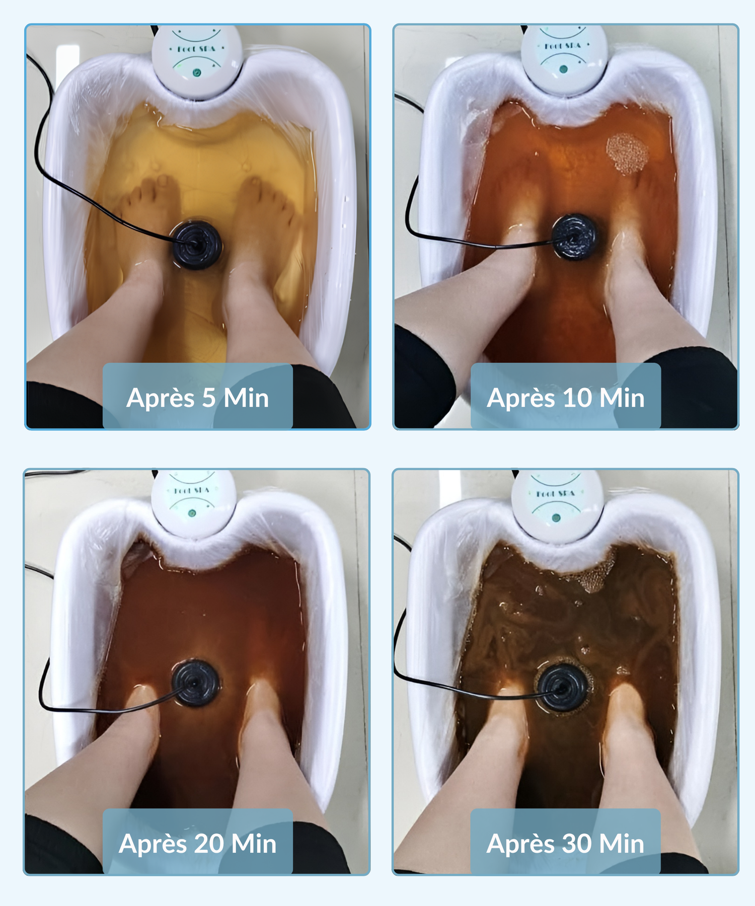 DetoxiPieds™ utilise une technologie de bain chauffant pour offrir une immersion agréable à vos pieds. Il aide à éliminer les toxines et à favoriser la détente grâce à l'eau chaude et à la stimulation de la circulation sanguine.