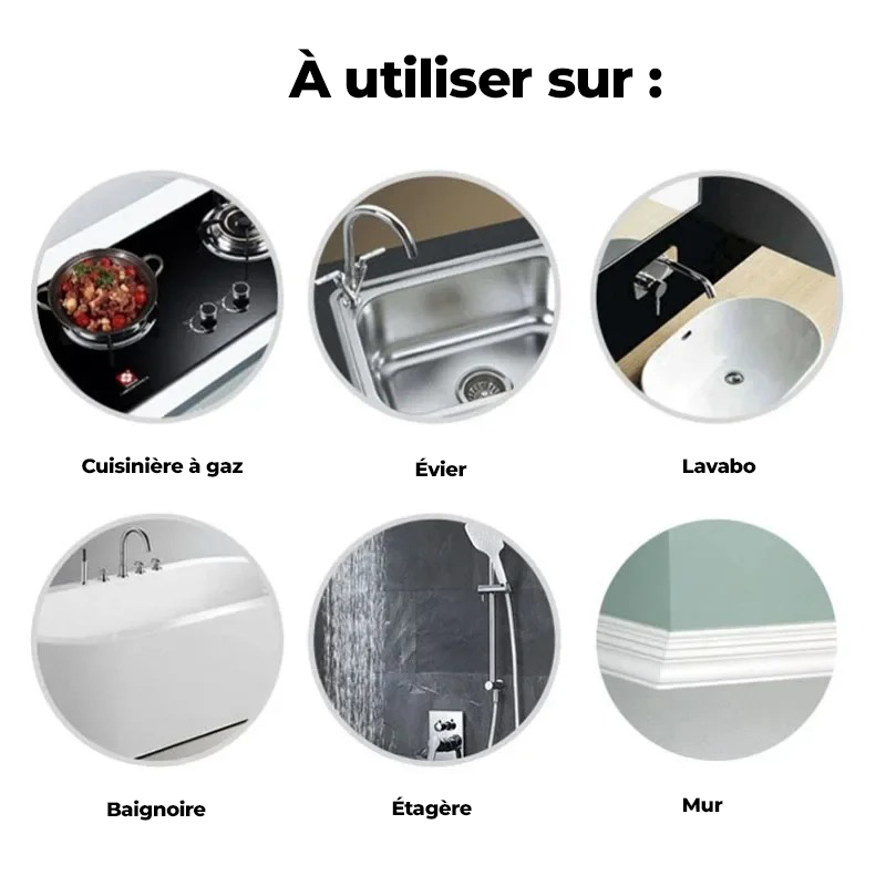 FixiClear™ adhère facilement à toutes les zones essentielles de la maison. Que ce soit sur la cuisinière, l’évier, le lavabo, la baignoire, une étagère ou un mur, il reste stable, propre et fiable.