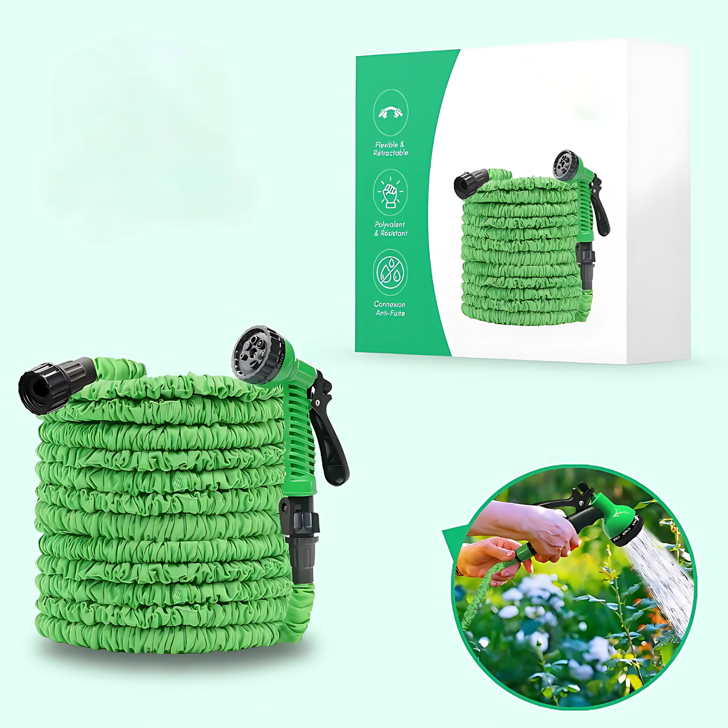 Profitez d’un arrosage efficace avec le JetFlex™, un tuyau extensible durable, équipé de 8 modes de jets haute pression pour un usage pratique et polyvalent dans votre jardin.