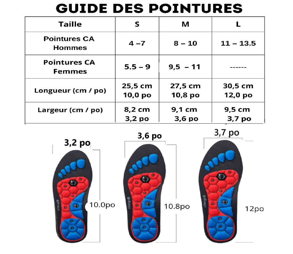 Les semelles Magnetic fonctionnent mieux dans les baskets, les bottes de travail, les chaussures décontractées et les chaussures de sport. Elles ne sont pas adaptées aux talons hauts, sandales ou chaussures de ville à coupe serrée.