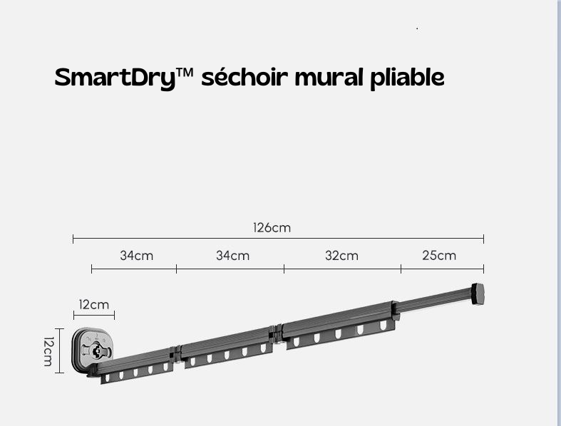 Le SmartDry™ séchoir mural pliable de Quebecool est spécialement conçu pour une installation facile et amovible, sans nécessiter de percer des trous dans le mur. Il peut être fermement fixé sur une surface lisse et plane.