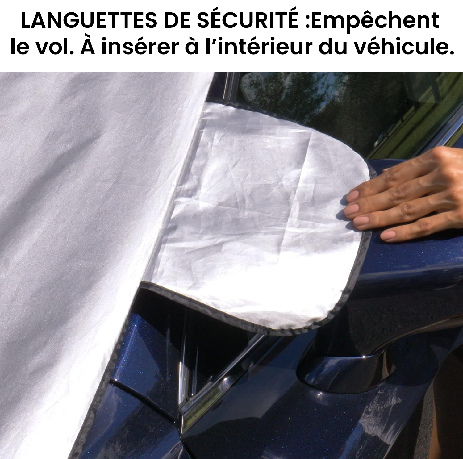 Les aimants puissants maintiennent la housse bien en place, tandis que les panneaux de sécurité glissés dans la portière empêchent le vol et bloquent les rafales de vent pour une stabilité totale.