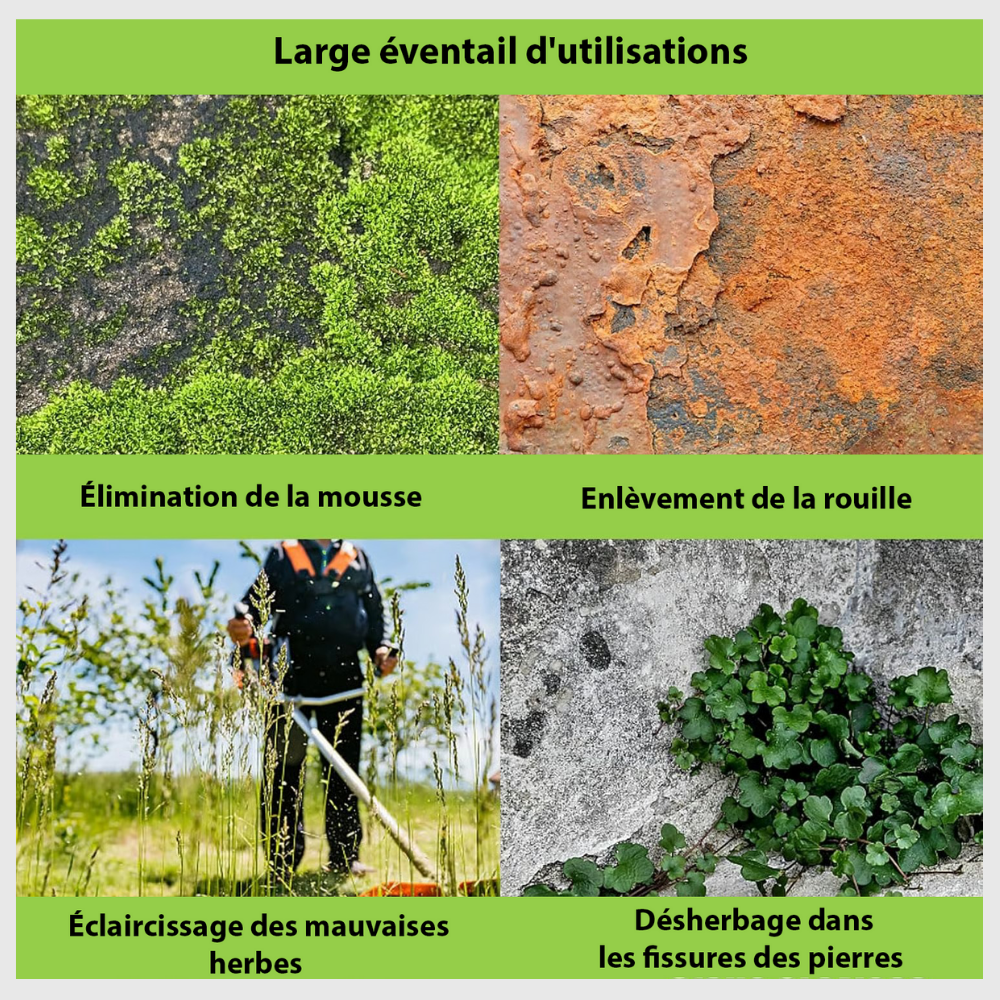 Notre tête de coupe est idéale pour une variété de tâches : élimination de la mousse, enlèvement de la rouille, éclaircissage des mauvaises herbes et désherbage dans les fissures des pierres. Un outil polyvalent pour un jardinage sans effort, efficace et précis à chaque utilisation. 🌱