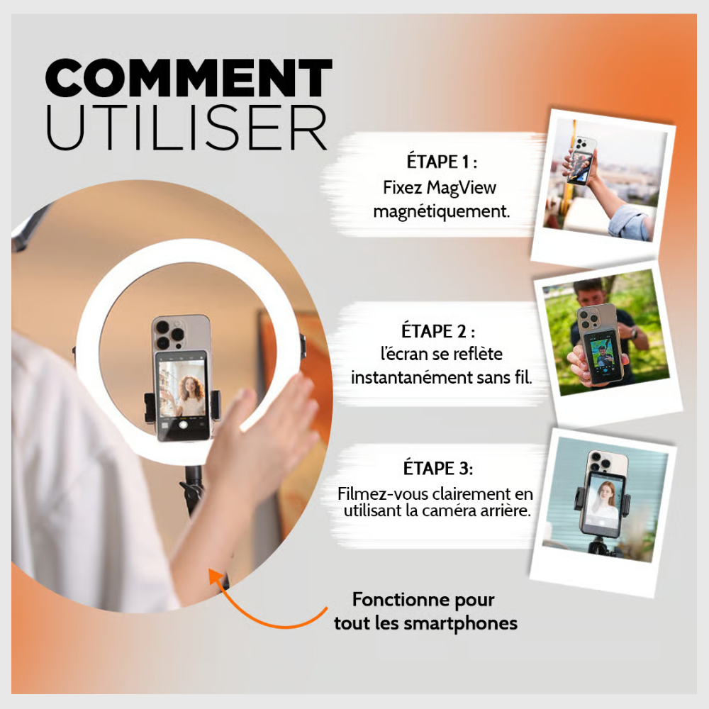 Fixez VlogCam™ magnétiquement, l'écran se reflète instantanément sans fil. Filmez-vous clairement en utilisant la caméra arrière de votre smartphone, pour un rendu impeccable, sur tous les modèles.